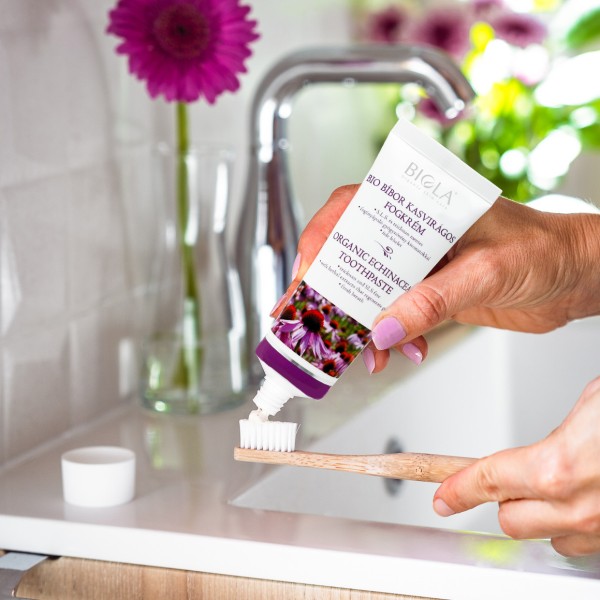 Ne feledd, hogy a megfelelő tisztítás alapja a helyes fogmosási gyakorlat, a rendszeresség, illetve a tudatosan megválasztott természetes összetevőkben gazdag fogápoló készítmény. A BIO BÍBOR KASVIRÁGOS FOGKRÉM hozzáadott fluoridot nem tartalmazó biokozmetikum. A holisztikus szemléletű fogorvosok által preferált természetes összetevő, hidroxiapatit hozzáadásával készül. A hidroxiapatit a fogzománcban is megtalálható ásványi anyag, amely fogkrémekben alkalmazva remineralizálja a fogzománcot, erősíti a fogakat, enyhíti a fogérzékenységet, valamint segít a fogszuvasodás megelőzésében.